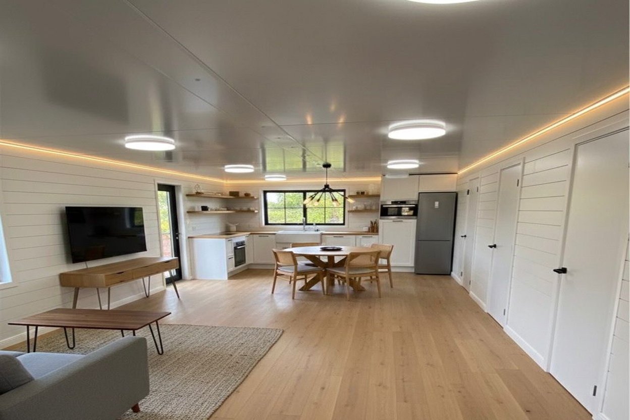Overview A premium, fully finished modular home engineered for comfort, durability, and modern U.S. living. Design 02 features a luxury architectural exterior with upgraded wood-grain cladding and a high-efficiency layout—complete with interiors, bathroom, kitchen setup, electrical fittings, insulated steel structure, and high-quality windows & doors.