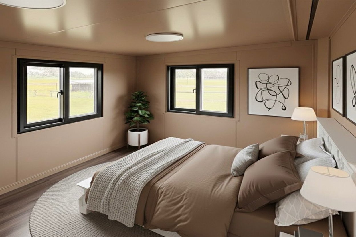 Available in 20ft, 30ft, and 40ft configurations. It features a striking contrast of white-trimmed windows and a central floor-to-ceiling glass entry, delivering a bright, dual-bedroom residential layout that is ready for immediate “Plug & Play” site connection. |