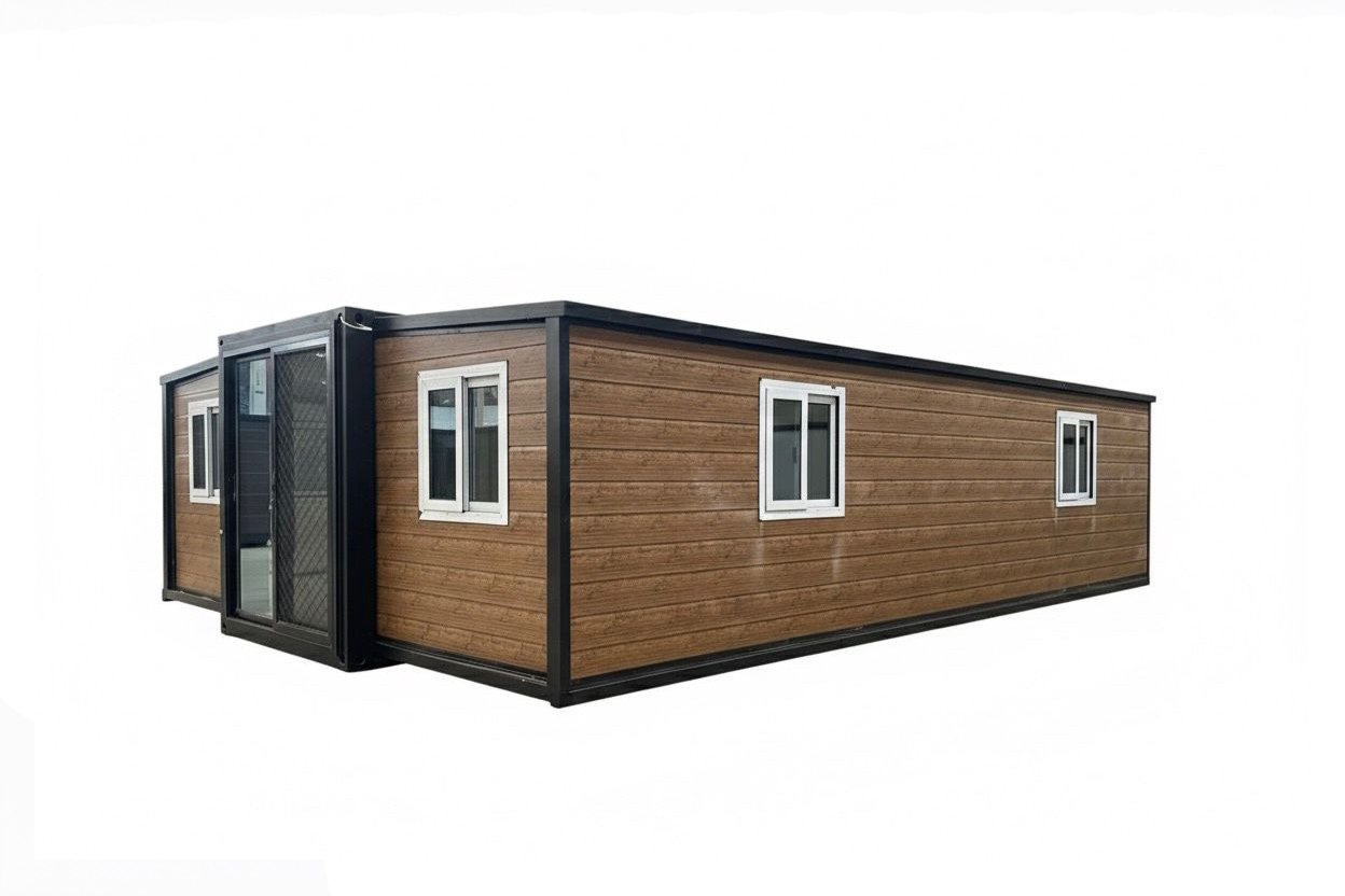| Overview | The AH-Series Design 07 bridges the gap between industrial efficiency and high-end residential warmth. Featuring a signature medium-oak embossed wood-grain exterior and a contrasting reinforced steel skeleton, this "Modern Cabin" edition offers a sophisticated aesthetic for vacation rentals, ADUs, or primary residences. Available in 20ft, 30ft, and 40ft configurations. This model features a rapid "Butterfly" expansion system, delivering a luxury 2-bedroom layout with a marble-accented bathroom and an open-concept living-dining zone. |